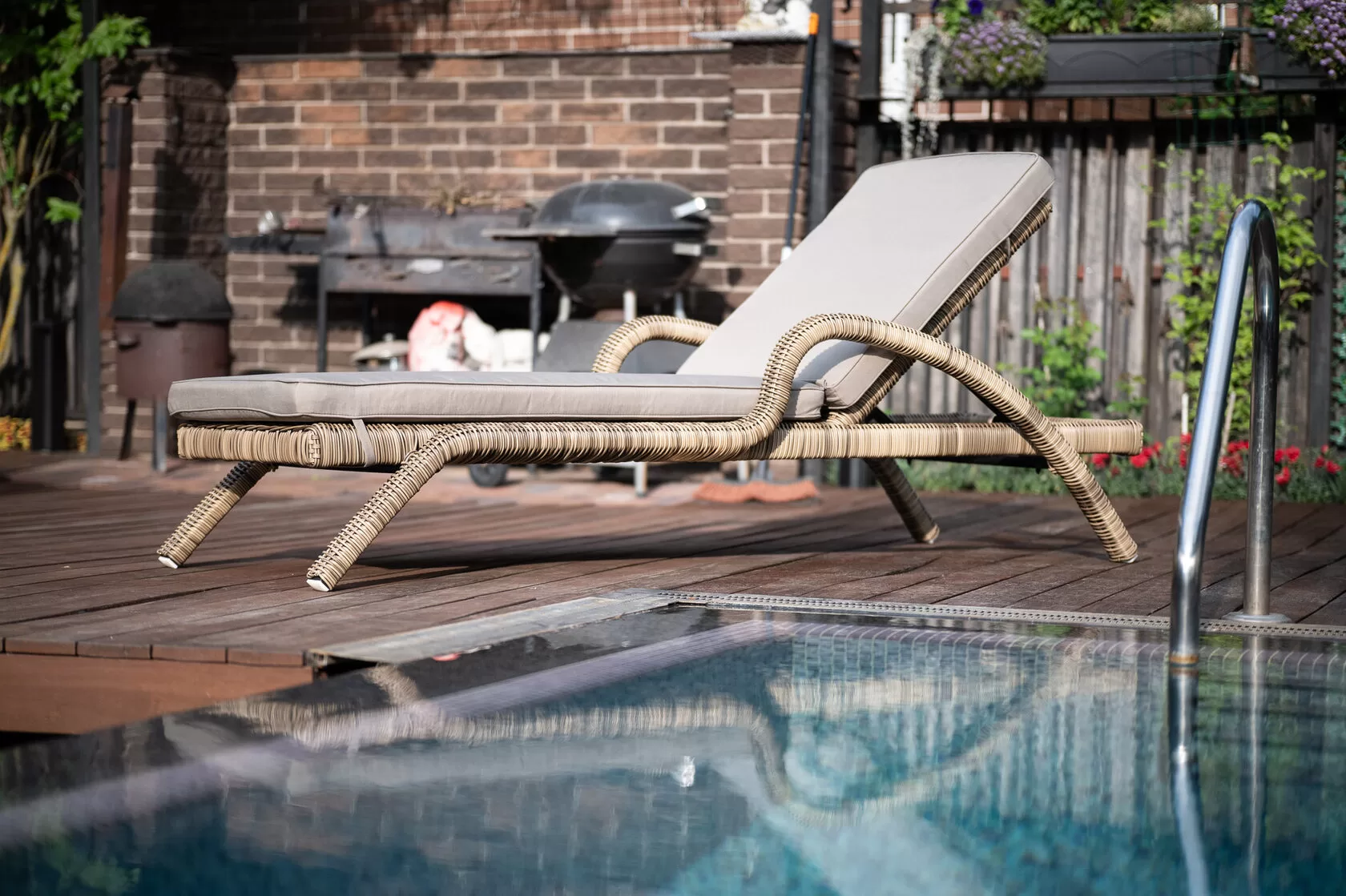 Шезлонг-лежак Фиджи сделан из качественного искусственного ротанга и имеет регулируемую по высоте спинку для комфортного использования шезлонга. Есть возможность разложить горизонтально, для удобства загорания на животе. Идет в комплекте с мягкой подушкой из высококачественного полиэстера с водоотталкивающей пропиткой при небольшом дожде. Чистка осуществляется мягкой тряпочкой с добавлением воды.